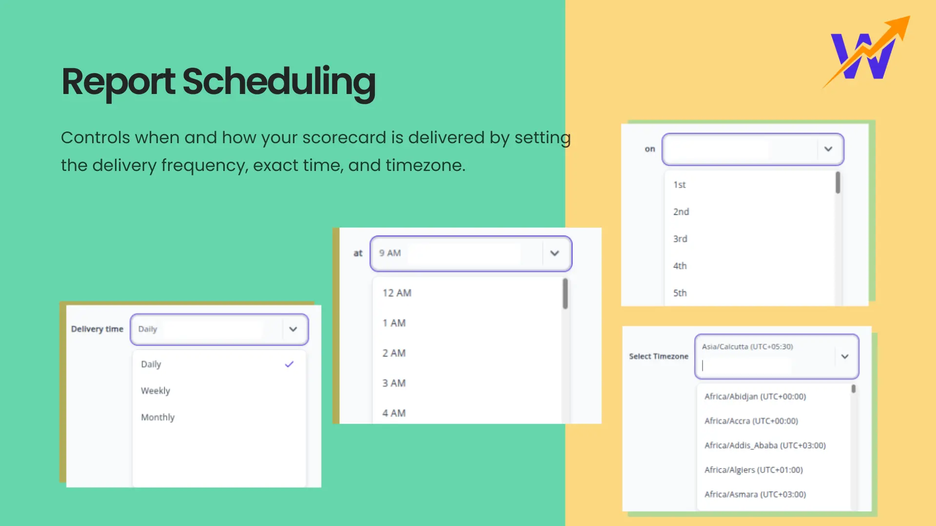 Controls when and how your scorecard is delivered by setting the delivery frequency, exact time, and timezone.