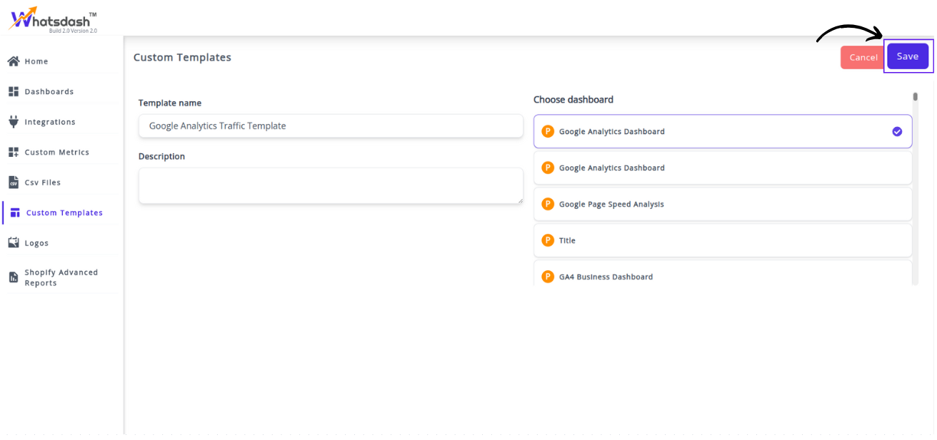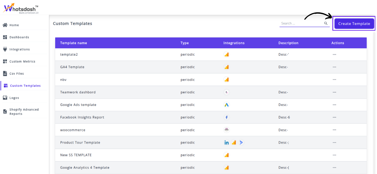 You can create a custom template in Whatsdash in two primary ways: from an existing dashboard or from the template creation menu.