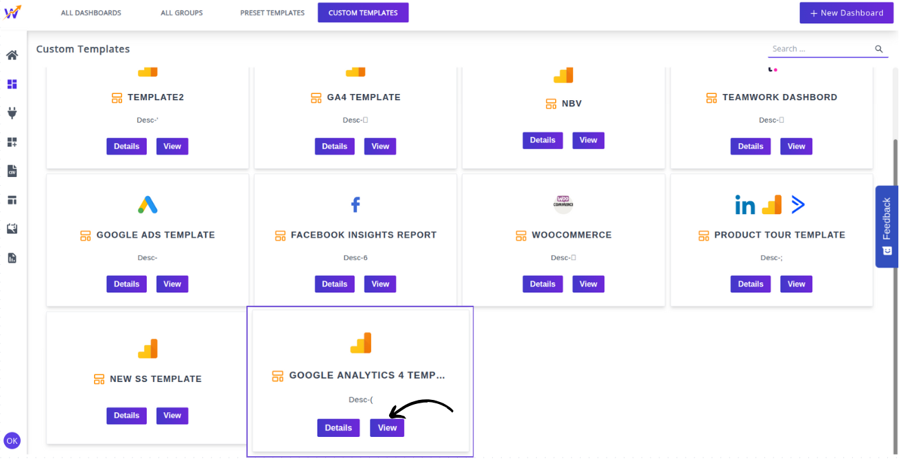 - The list of your existing dashboards will appear. Select the dashboard whose structure you want to save as your new template and provide Template Name and Template Description